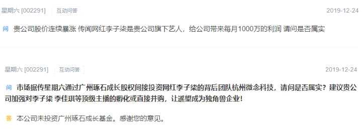 在公司股價(jià)連續(xù)上漲之際,火遍海外的頂級(jí)流量李子柒也被傳言是公司旗下藝人,目前這一說法尚未得到回復(fù)。此外,此前市場(chǎng)猜測(cè)星期六通過某私募基金投資李子柒團(tuán)隊(duì)則被其否認(rèn)。
