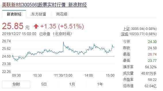2019年12月27日消息,今日10時47分,【美聯(lián)新材(300586)、股吧】(300586)出現(xiàn)異動,附加大幅拉升3.27%,創(chuàng)歷史新高(前復(fù)權(quán)價格)。午間時分,該股25.3元/股,成交量19.6366萬手,換手率30.95%,振幅7.27%,量比1.76。
