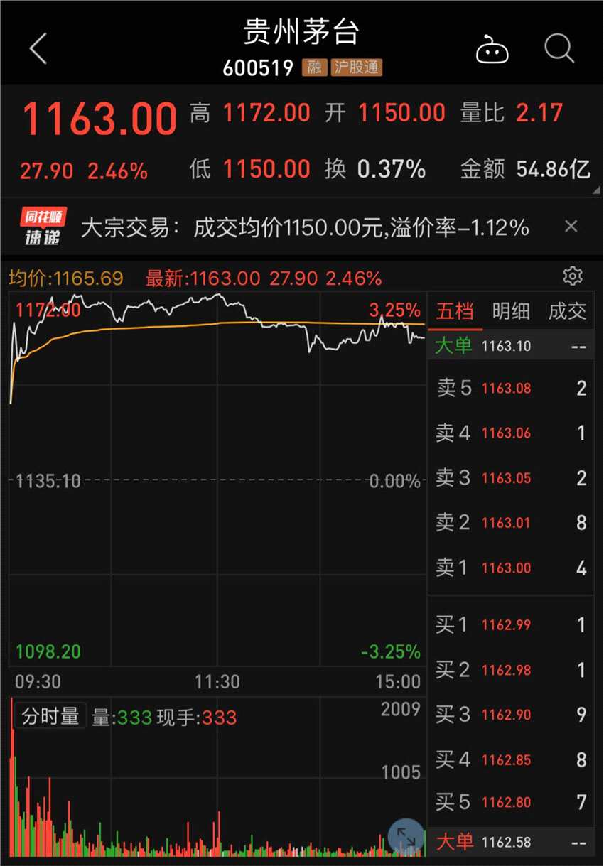 截至今日收盤,貴州茅臺報1163元/股,漲幅2.46%,總市值1.5萬億元,動態(tài)市盈率35.98倍,市凈率為11.66倍。