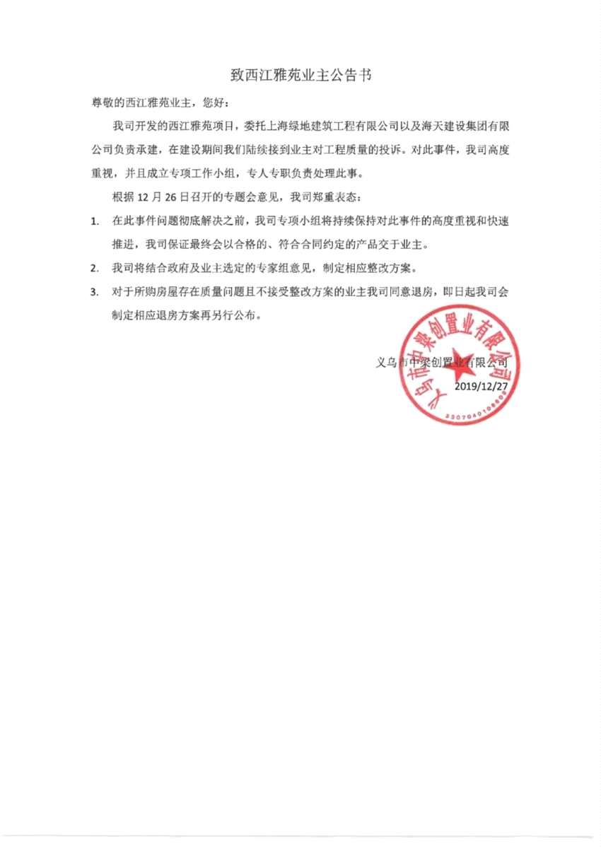 在公告書中,中梁創(chuàng)置業(yè)稱,公司開發(fā)的西江雅苑項(xiàng)目,委托上海綠地建筑工程有限公司以及海天建設(shè)集團(tuán)有限公司負(fù)責(zé)承建,在建設(shè)期間陸續(xù)接到業(yè)主對(duì)工程質(zhì)量的投訴。對(duì)此事件,公司高度重視,并且成立專項(xiàng)工作小組,專人專職負(fù)責(zé)處理此事。