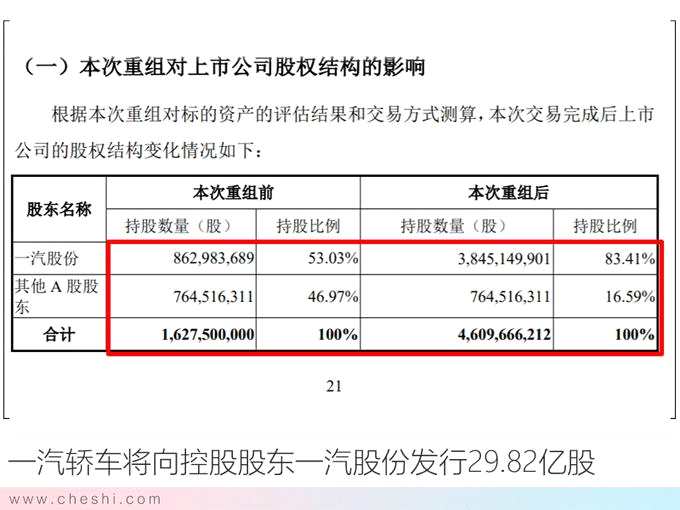 由于需要向一汽股份發(fā)行股份補置換資產(chǎn)的差價,重組結束后的上市公司股權結構將被調整。公告顯示,此次上市公司將發(fā)行29.82億股(發(fā)行價以之前120個交易日平均價的90%計算6.68元/股),總股本從16.27億股增至46.09億股,控股股東一汽股份持股比例53.03%增至83.41%,其他股東的持股比例將從46.97%稀釋至16.59%。當然,前后變化較大的股權結構也為重組完成后上市公司增發(fā)埋下伏筆,畢竟國企上市本就是吸引民營資本強化市場意識,如果國有資本占比過高就失去了實際意義。