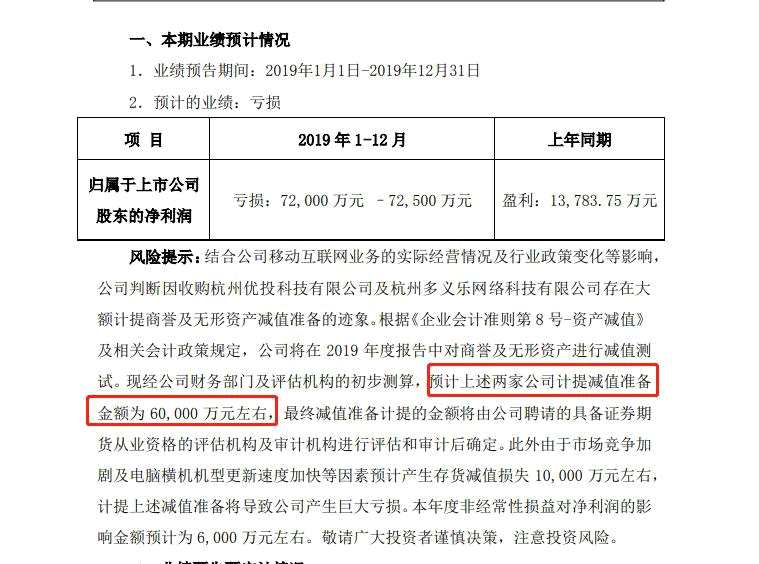 慈星股份發(fā)布業(yè)績(jī)預(yù)告,2019年預(yù)虧7.2億元至7.25億元,上年同期盈利1.38億元。公司判斷因收購(gòu)杭州優(yōu)投科技有限公司及杭州多義樂(lè)網(wǎng)絡(luò)科技有限公司存在大額計(jì)提商譽(yù)及無(wú)形資產(chǎn)減值準(zhǔn)備的跡象,經(jīng)測(cè)算,預(yù)計(jì)上述兩家公司計(jì)提減值準(zhǔn)備的金額預(yù)計(jì)在6億元左右。