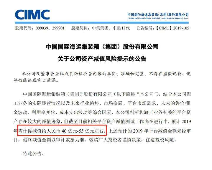 【中集集團(tuán)(000039)、股吧】公告,公司判斷和海工業(yè)務(wù)有關(guān)的平臺(tái)資產(chǎn)存在較大的減值跡象,截至目前相關(guān)平臺(tái)資產(chǎn)減值測(cè)試工作尚在進(jìn)行中,預(yù)計(jì)2019年需計(jì)提減值約40億元-55億元。