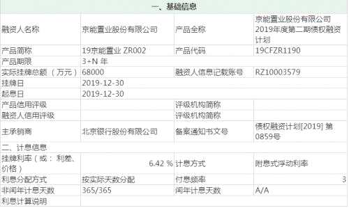 據公告顯示,本期債券簡稱“19京能置業(yè)ZR002”,產品代碼為19CFZR1190。本期債券發(fā)行總額為6.8億元,期限為3+N年,利率為6.42%。