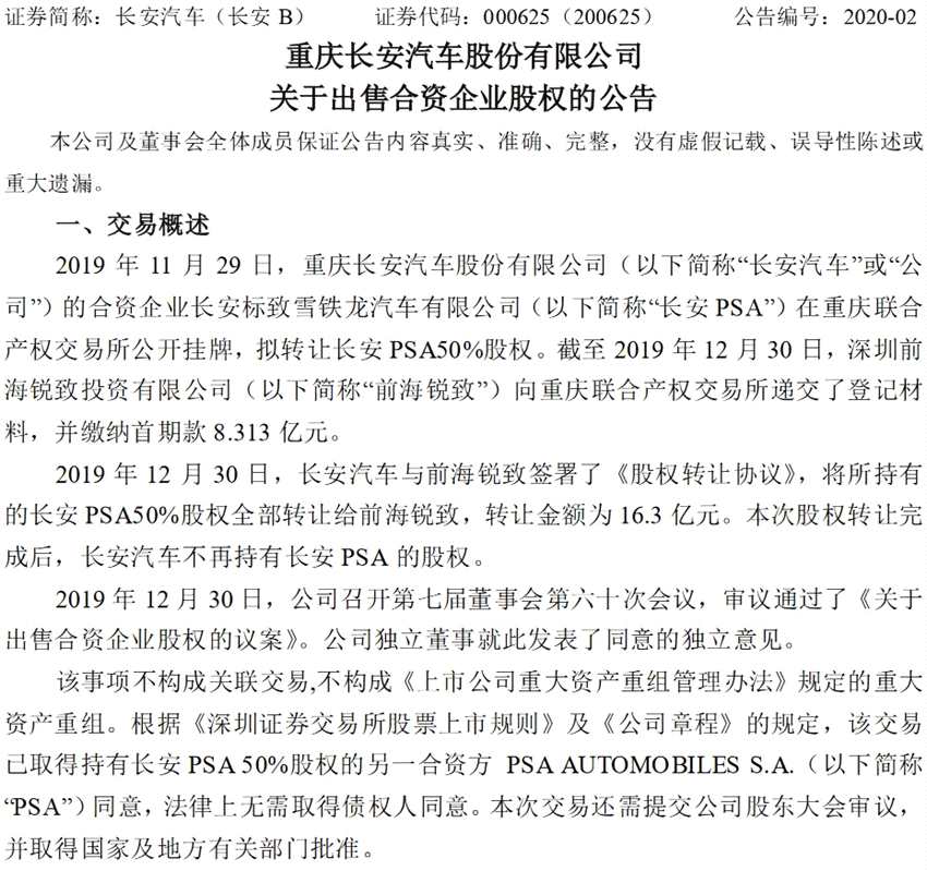 12月31日,【長安汽車(000625)、股吧】(000625)對外發(fā)布《關于出售合資企業(yè)股權的公告》。《公告》顯示,長安汽車已在12月30日與深圳前海銳致投資有限公司(前海銳致)簽署了《股權轉讓協(xié)議》,將所持有的長安標致雪鐵龍汽車有限公司(長安PSA)50%股權全部轉讓給前海銳致,轉讓金額為16.3 億元,本次股權轉讓完成后,長安汽車不再持有長安 PSA 的股權。