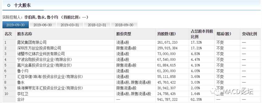 公司的實(shí)際控制人是:李伯英,魯永,魯小均。2018年末至2019年9月30日露笑集團(tuán)有限公司持股比例由32.77%減持至17.32%。