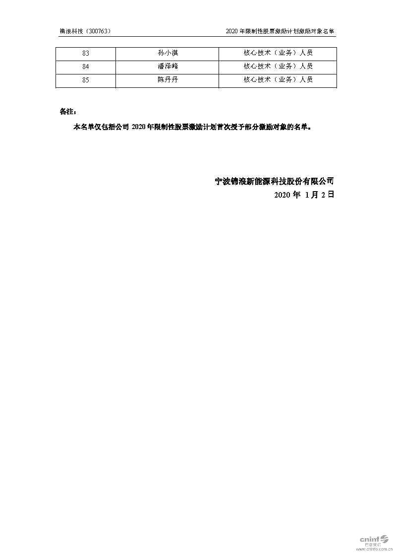 摘要: 消息:2020年1月2日,寧波錦浪新能源科技股份有限公司公告“2020年限制性股票激勵計劃激勵對象名單”。此前,錦浪科技(300763)(300763.SZ)發(fā)布2020年限制性股票激勵計劃(草案)摘