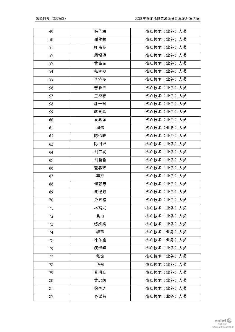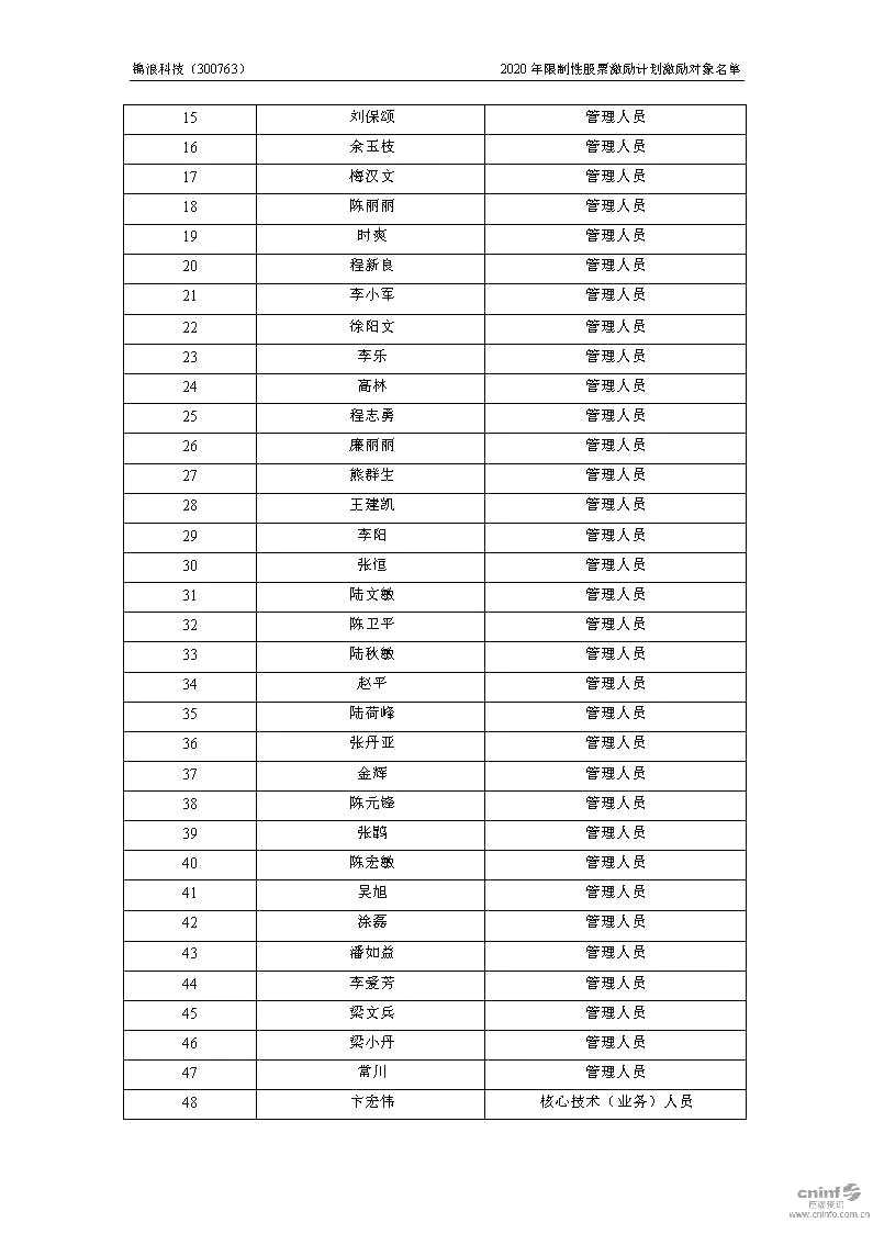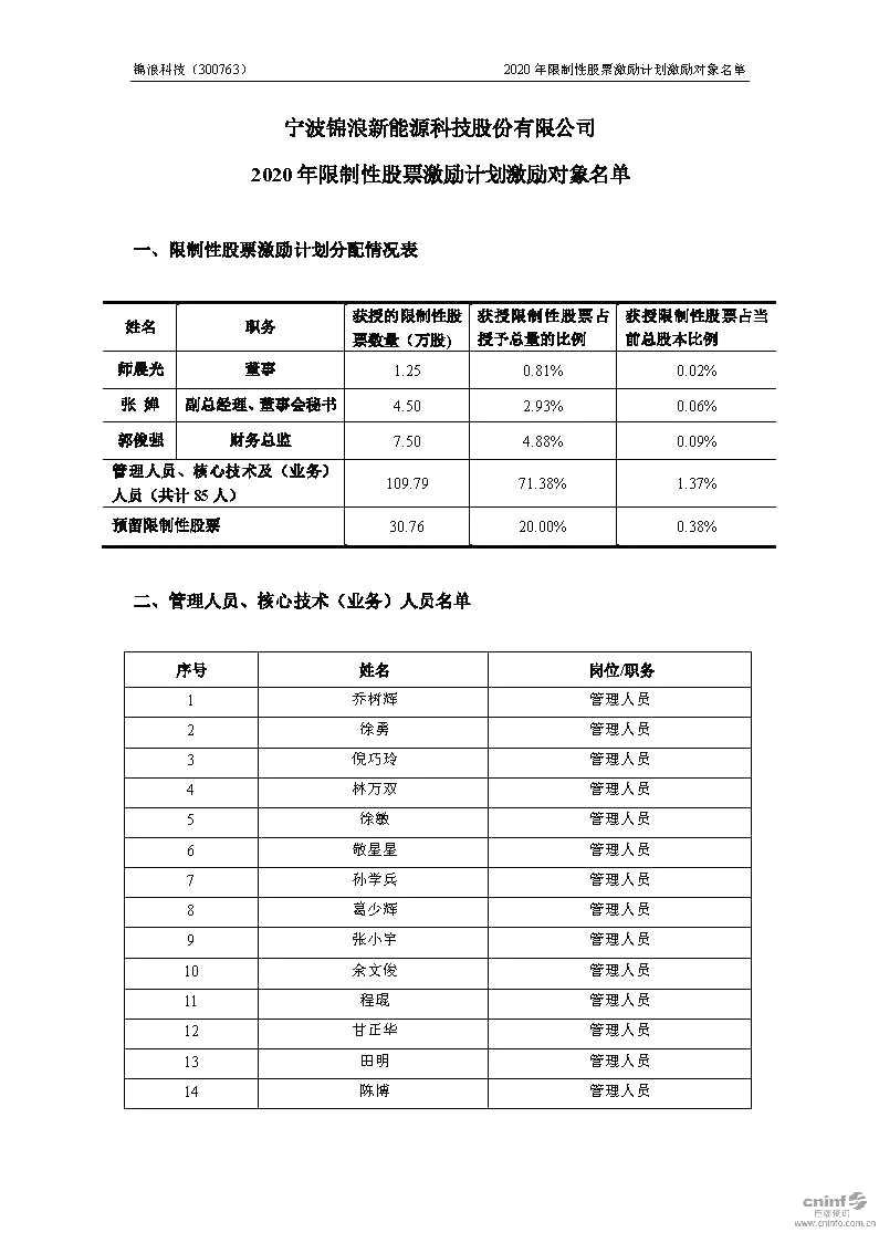 消息: 2020 年 1 月 2 日,寧波錦浪新能源科技股份有限公司公告“2020年限制性股票激勵計劃激勵對象名單”。此前,錦浪科技(300763)(300763.SZ)發(fā)布2020年限制性股票激勵計劃(草案)摘要,本計劃授予的激勵對象總?cè)藬?shù)為88人,擬向激勵對象授予限制性股票總計為153.8萬股,占本激勵計劃草案公告當日公司股本總額的1.92%。其中,首次授予123.04萬股,占本激勵計劃草案公告當日公司股本總額的1.54%;預留30.76萬股,占本激勵計劃草案公告當日公司股本總額的0.38%,預留部分占本次授予權益總額的20%。