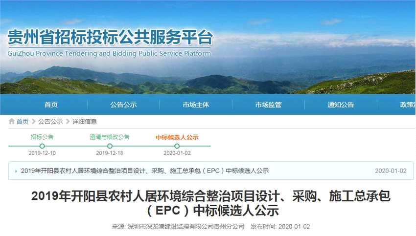 1月5日,【博世科(300422)、 2020年1月2日,貴州省招標(biāo)投標(biāo)公共服務(wù)平臺(tái)(http://ztb.guizhou.gov.cn)發(fā)布了《2019年開陽縣農(nóng)村人居環(huán)境綜合整治項(xiàng)目設(shè)計(jì)、采購、施工總承包(EPC)中標(biāo)候選人公示》,確定聯(lián)合體成為該項(xiàng)目的第一中標(biāo)候選人,該項(xiàng)目金額為16,964.55 萬元。 項(xiàng)目規(guī)模為開陽縣農(nóng)房風(fēng)貌改造工程:貴遵復(fù)線、貴甕高速、甕開高速沿線可視范圍內(nèi)的農(nóng)房風(fēng)貌改造。生活污水處理工程:涉及城關(guān)城(頂方村、魚上村)、楠木渡鎮(zhèn)(勝利村、中和村、黃木村)、雙流鎮(zhèn)(劉育村、白安營村)、永溫鎮(zhèn)(安大村、雙合村、大壩村、永亨村、坤建村)、馮三鎮(zhèn)(安坪村)、禾豐鄉(xiāng)(穿洞村、田沖村)、南江鄉(xiāng)(南江村)、龍崗鎮(zhèn)(大石板村)、毛云鄉(xiāng)(毛栗莊村)等18個(gè)“提升型”村寨農(nóng)村生活污水處理站點(diǎn)及配套管網(wǎng)。富美鄉(xiāng)村建設(shè)工程:城關(guān)鎮(zhèn)頂方村、南江鄉(xiāng)南江村、禾豐鄉(xiāng)田沖村、龍崗鎮(zhèn)大石板村、楠木渡鎮(zhèn)勝利村、臨江村等6個(gè)富美鄉(xiāng)村建設(shè)。飲用水源保護(hù)工程:涉及城關(guān)鎮(zhèn)頂方村白安河水庫集中式飲用水源、雙流鎮(zhèn)劉育村翁井水庫集中式飲用水源、楠木渡鎮(zhèn)臨江村元豐水庫集中式飲用水源、毛云鄉(xiāng)毛栗莊村云灣水庫集中式飲用水源等4個(gè)飲用水源地保護(hù)。農(nóng)村垃圾治理工程:建設(shè)農(nóng)村生活垃圾收集轉(zhuǎn)運(yùn)體系。農(nóng)村公廁建設(shè)工程:建設(shè)40個(gè)農(nóng)村公廁。 項(xiàng)目工期為365天。