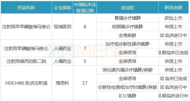 數(shù)據(jù)顯示,目前國內市場已有4款創(chuàng)新麻醉劑申報上市,恒瑞醫(yī)藥的注射用甲苯磺酸瑞馬唑侖已順利獲批上市,人福藥業(yè)的注射用苯磺酸瑞馬唑侖、注射用磷丙泊酚二鈉及海思科的HSK3486乳狀注射液的上市申請還處于“在審評審批中(在藥審中心)”狀態(tài)。