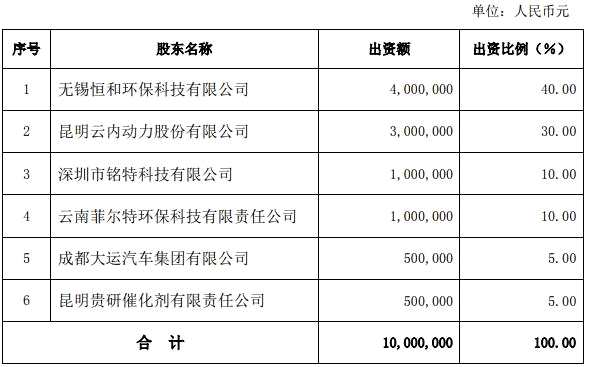 1月8日,【云內(nèi)動(dòng)力(000903)、股吧】(000903)發(fā)布關(guān)于公司及全資子公司與關(guān)聯(lián)方和第三方共同出資成立公司的公告,公司及全資子公司深圳市銘特科技有限公司(以下簡(jiǎn)稱“銘特科技”)擬與無錫恒和環(huán)??萍加邢薰荆ㄒ韵潞?jiǎn)稱“無錫恒和”)、云南菲爾特環(huán)??萍脊煞萦邢薰荆ㄒ韵潞?jiǎn)稱“云南菲爾特”)、成都大運(yùn)汽車集團(tuán)有限公司(以下簡(jiǎn)稱“成都大運(yùn)”)及昆明貴研催化劑有限責(zé)任公司(以下簡(jiǎn)稱“昆明貴研”)組建云南同潤(rùn)尾氣環(huán)保科技有限公司(以下簡(jiǎn)稱“同潤(rùn)尾氣”)。