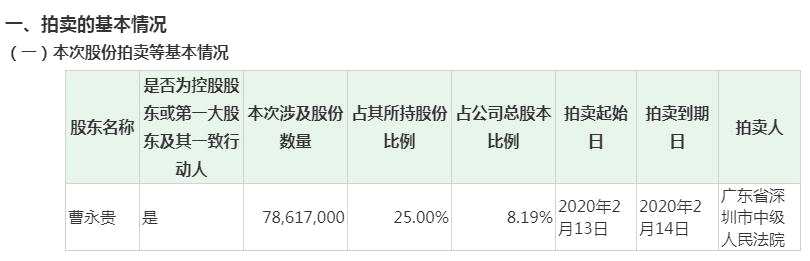 公告稱,拍賣(mài)執(zhí)行標(biāo)的涉及中融國(guó)際信托股份有限公司(下稱中融信托)融資債權(quán)共5.00億元。本次針對(duì)控股股東曹永貴股票的網(wǎng)絡(luò)司法拍賣(mài)起拍價(jià)為1.75億元,股數(shù)為7861.7萬(wàn)股。拍賣(mài)保證金為1750萬(wàn)元,增價(jià)幅度均為50萬(wàn)元。