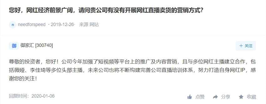 1月6日,御家匯對(duì)上述問題進(jìn)行了回復(fù),稱公司加強(qiáng)了短視頻等平臺(tái)上的推廣及內(nèi)容營銷,且與多位網(wǎng)紅主播建立合作,包括薇婭、李佳琦等多位頭部主播,未來公司也將不斷構(gòu)建完善公司直播培訓(xùn)體系,努力打造自身網(wǎng)紅IP。