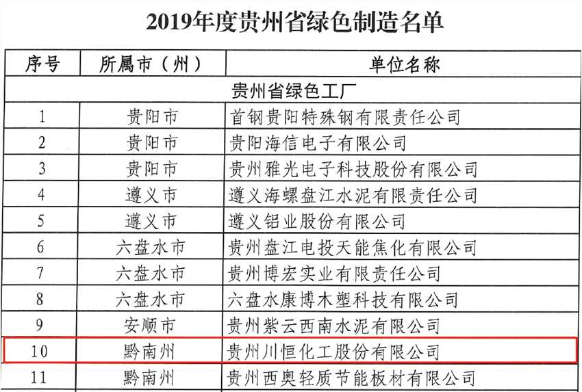 川恒股份入圍貴州省綠色制造名單
