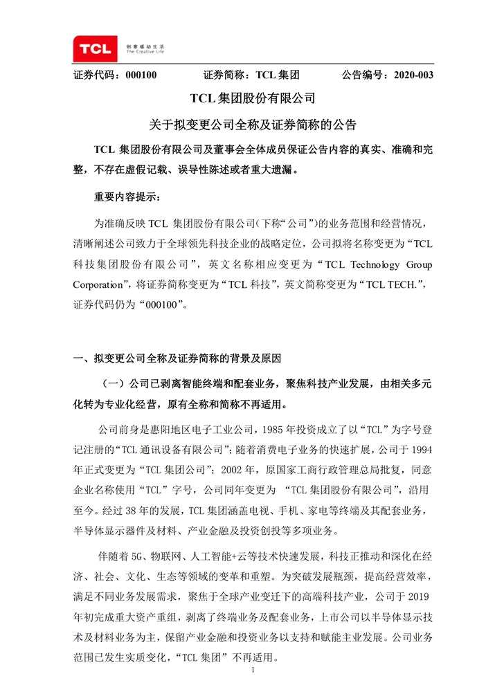 1月13日上午消息,TCL集團(tuán)(000100)發(fā)布公告稱,擬將名稱變更為“TCL科技集團(tuán)股份有限公司”,英文名稱相應(yīng)變更為“TCL Technology Group Corporation”,將證券簡稱變更為“TCL科技”,英文簡稱變更為“TCL TECH.”,證券代碼仍為“000100”。