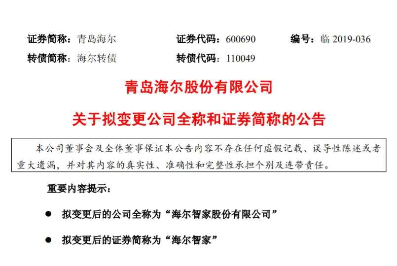 2019年6月5日,青島海爾發(fā)布公告稱,上市公司中文名稱由“青島海爾股份有限公司”擬變更為“海爾智家(600690)股份有限公司”;證券簡(jiǎn)稱由“青島海爾”擬變更為“海爾智家”;公司英文簡(jiǎn)稱也從“Qingdao Haier”擬變更為“Haier Smart Home”。