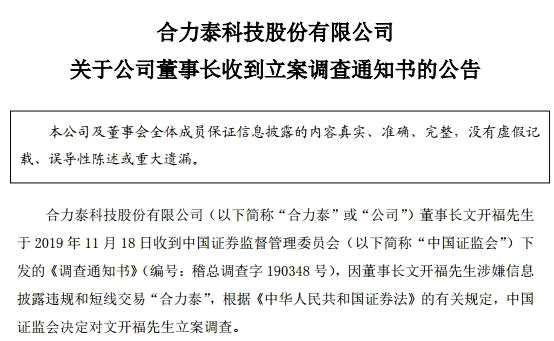2019年11月19日晚間,合力泰曾發(fā)布公告稱,公司董事長文開福收到證監(jiān)會(huì)下發(fā)的《調(diào)查通知書》,因其涉嫌信息披露違規(guī)和短線交易“合力泰”,證監(jiān)會(huì)決定對文開福立案調(diào)查。