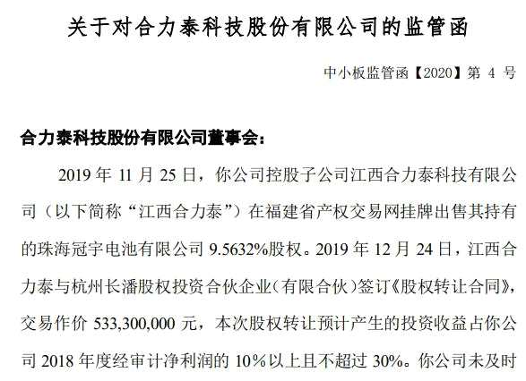 2019年11月25日,合力泰控股子公司江西合力泰科技有限公司(以下簡稱“江西合力泰”)在福建省產(chǎn)權(quán)交易網(wǎng)掛牌出售其持有的珠海冠宇電池有限公司9.5632%股權(quán)。2019年12月24日,江西合力泰與杭州長潘股權(quán)投資合伙企業(yè)(有限合伙)簽訂《股權(quán)轉(zhuǎn)讓合同》,交易作價(jià)533,300,000元,本次股權(quán)轉(zhuǎn)讓預(yù)計(jì)產(chǎn)生的投資收益占你公司2018年度經(jīng)審計(jì)凈利潤的10%以上且不超過30%。合力泰未及時(shí)披露上述股權(quán)轉(zhuǎn)讓事項(xiàng),直至2019年12月31日才對外披露。