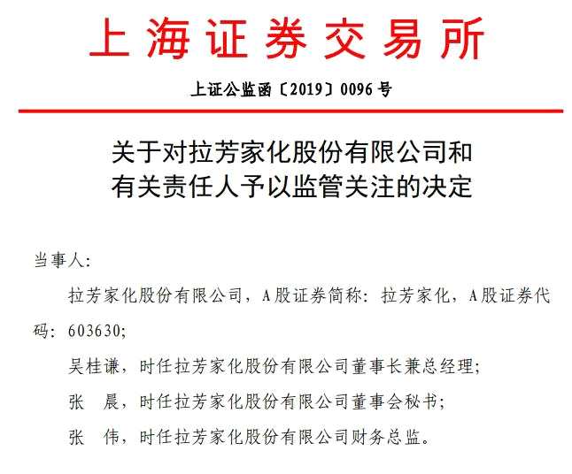 根據(jù)《上海證券交易所股票上市規(guī)則》第17.1條和《上海證券交易所紀(jì)律處分和監(jiān)管措施實(shí)施辦法》的有關(guān)規(guī)定,上交所上市公司監(jiān)管一部做出如下監(jiān)管措施決定:對(duì)拉芳家化及其時(shí)任董事長(zhǎng)兼總經(jīng)理吳桂謙、董事會(huì)秘書(shū)張晨、財(cái)務(wù)總監(jiān)張偉給予監(jiān)管關(guān)注。