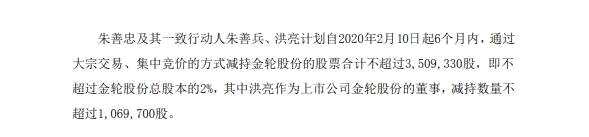 1月10日消息,【【金輪股份(002722)、股吧】(002722)】(002722)發(fā)布公告稱,股東朱善忠及其一致行動人朱善兵、洪亮計劃自2020年2月10日起6個月內,通過大宗交易、集中競價的方式減持金輪股份的股票合計不超過3,509,330股,即不超過金輪股份總股本的2%,其中洪亮作為上市公司金輪股份的董事,減持數(shù)量不超過1,069,700股。