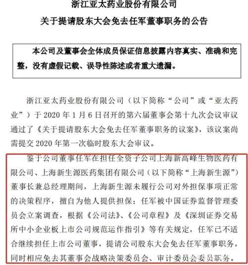 2020年1月7日,亞太藥業(yè)發(fā)布公告,提請股東大會免去上海新高峰董事長兼總經(jīng)理任軍的董事職務(wù)。