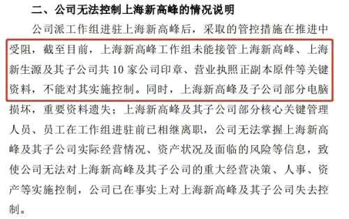 2019年12月25日,亞太藥業(yè)公告稱,對子公司上海新高峰失去控制。亞太藥業(yè)表示,公司于2019年11月25日派工作組進駐上海新高峰,采取的管控措施在推進中受阻,上海新高峰工作組未能接管上海新高峰、上海新生源及其子公司共10家公司印章、營業(yè)制造正副本原件等關(guān)鍵資料,不能對其實施控制。