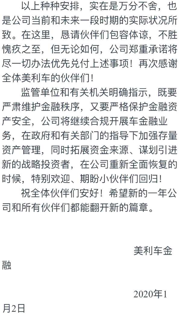 據(jù)爆料人透露,1月2日美利車金融發(fā)郵件稱,公司資金鏈緊張,希望大家自謀出路,之后又陸續(xù)發(fā)布兩封郵件,員工的工作被截止到了1月10日。而對于12月份的工資、賠償方案、內部員工的理財計劃提現(xiàn)等,并未給出具體解決方案。