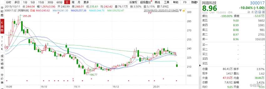 今日,網(wǎng)宿科技(300017)低開8%,隨后一字跌停,截止收盤,股價(jià)報(bào)收8.96元,最新總市值為218億元,最新成交額為7.82億元。