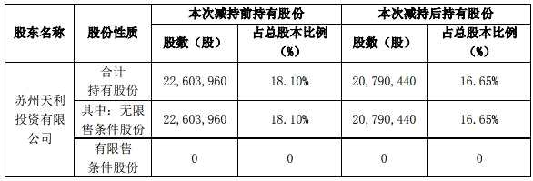 本次減持前,蘇州天利合計持有科創(chuàng)新源2260.40萬股,占總股本12486.65萬股的18.10%;本次減持后,蘇州天利合計持有科創(chuàng)新源2079.04萬股,占總股本12486.65萬股的16.65%。