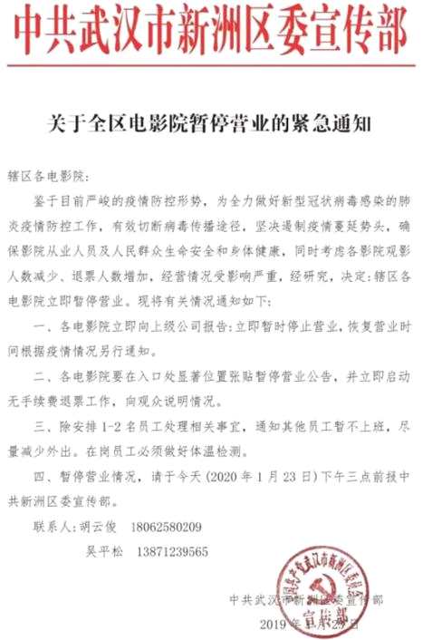 今天,武漢各區(qū)發(fā)布影院關(guān)停消息。