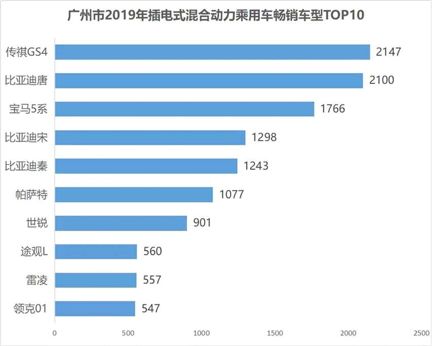 據(jù)數(shù)據(jù)統(tǒng)計,2019年廣州市插電式混合動力乘用車上險量前十榜單中,合資車型占據(jù)將近40%的市場份額。