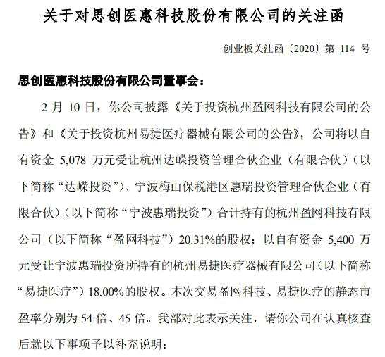 2月11日,深交所下發(fā)對思創(chuàng)醫(yī)惠的關注函,并提出了8大問題要求說明。
