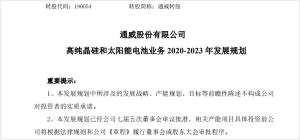 通威股份發(fā)布高純晶硅和太陽(yáng)能電池業(yè)務(wù)2020-2023年發(fā)展規(guī)劃