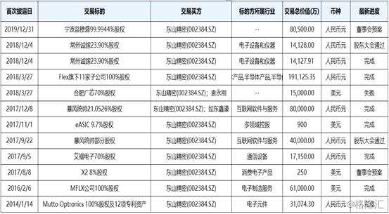 據(jù)不完全統(tǒng)計(jì),自2014年至今,東山精密總共發(fā)起了12次并購(gòu),完成了其中的7筆,其中5筆以人民幣結(jié)算合計(jì),對(duì)價(jià)約為33.35億元,另2筆以美元結(jié)算,對(duì)價(jià)為6.19億元。