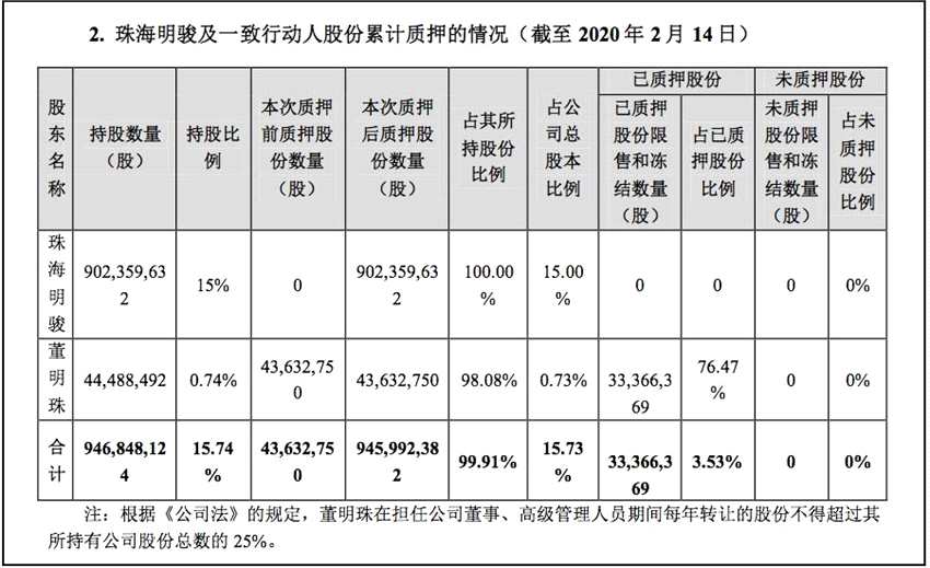 截至2月14日,珠海明駿及其一致行動(dòng)人董明珠質(zhì)押股份共計(jì)逾9.46億股,占其所持股份比例的99.91%,占總股本的15.73%。
