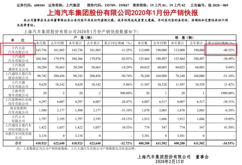 2月17日電日前,上汽集團(tuán)(600104)公布2020年1月產(chǎn)銷快報(bào)。數(shù)據(jù)顯示,今年1月,上汽集團(tuán)共售出汽車40.02萬(wàn)輛,比上年同期減少了34.55%。作為中國(guó)汽車工業(yè)的龍頭企業(yè),上汽集團(tuán)2020年的首月表現(xiàn)并不理想,跌幅遠(yuǎn)遠(yuǎn)大于中國(guó)汽車工業(yè)協(xié)會(huì)此前預(yù)計(jì)18%的汽車行業(yè)平均下降水平。
