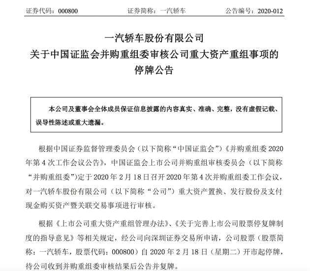 根據(jù)相關規(guī)定,一汽轎車股票2月18日(星期二)開市起停牌,待公司收到并購重組委審核結(jié)果后公告并復牌。