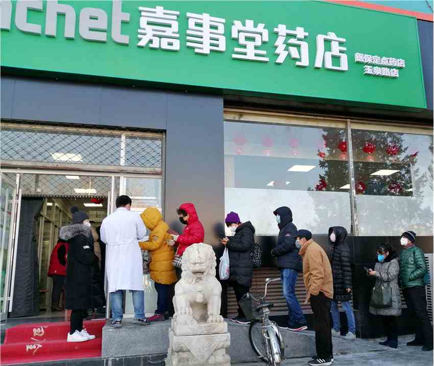 ▲市民在嘉事堂玉泉路藥店門前排隊(duì)購(gòu)買口罩