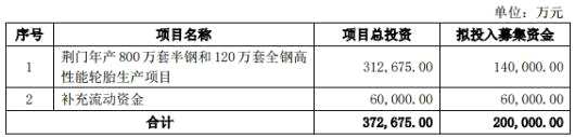 扣除發(fā)行費(fèi)用后,這筆款項(xiàng)將用于荊門年產(chǎn)800萬套半鋼和120萬套全鋼高性能輪胎生產(chǎn)項(xiàng)目,以及補(bǔ)充流動(dòng)資金。