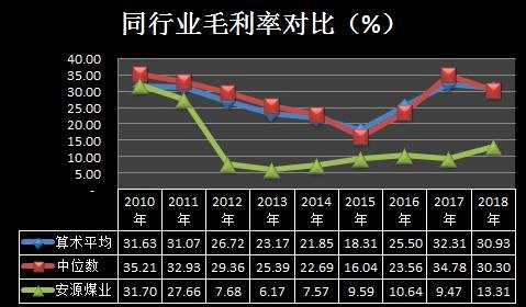 考慮到中國神華作為龍頭企業(yè),對比或許還不夠明顯。通過查詢同花順(300033)iFinD數(shù)據(jù),按中信行業(yè)分類煤炭開采洗選口徑篩選出的同行毛利率顯示:無論是同行業(yè)上市公司的毛利率的算術平均還是中位數(shù),2010年和2011年安源煤業(yè)與同行相差并不大,但是從2012年開始,安源煤業(yè)的毛利率始終遠低于行業(yè)平均,尤其是2015年之后煤炭價格觸底回升之后,這一差異顯得尤為突出。