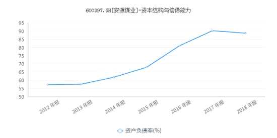 從資產(chǎn)負債率來看,安源煤業(yè)的負債率自2012年開始就一路攀升,從2012年的57.34%一直攀升到2017年的高點90.2%,2018年雖然略有下降,但依然高達88.68%。