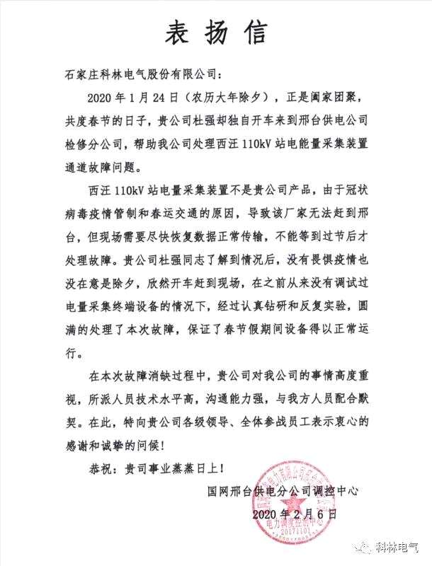 近日,科林電氣(603050)收到一封來(lái)自國(guó)網(wǎng)邢臺(tái)供電分公司調(diào)度中心的感謝信,信中高度評(píng)價(jià)了公司員工杜強(qiáng)心系客戶、犧牲假期、竭誠(chéng)服務(wù)的優(yōu)良品質(zhì),充分肯定了他的技術(shù)水平和業(yè)務(wù)能力,及時(shí)解決了設(shè)備故障,有效保證了春節(jié)假期間設(shè)備的正常運(yùn)行。表?yè)P(yáng)信具體內(nèi)容如下: