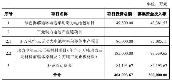 本次發(fā)行計(jì)劃募集資金總額不超過(guò)30億元,扣除發(fā)行費(fèi)用后的募集資金凈額將用于投資綠色拆解循環(huán)再造車用動(dòng)力電池包項(xiàng)目、三元?jiǎng)恿﹄姵禺a(chǎn)業(yè)鏈項(xiàng)目。