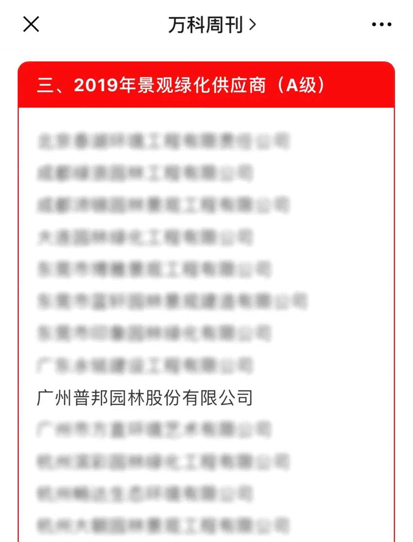 萬(wàn)科集團(tuán)發(fā)布《萬(wàn)科2019年度合格供應(yīng)商名錄》,我司入選景觀綠化供應(yīng)商A級(jí)名單。A級(jí)供應(yīng)商為評(píng)選的最高等級(jí),從1563家供應(yīng)商中選出,入選率僅為16%。
