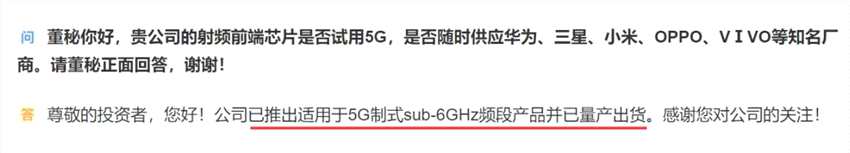卓勝微1月9日回復投資者時表示,公司已推出適用于5G制式sub-6GHz頻段產(chǎn)品并已量產(chǎn)出貨。