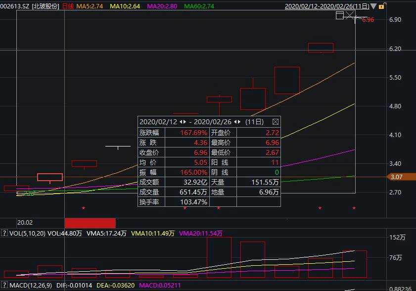 2月11日收盤(pán)時(shí),該股報(bào)2.6元/股,之后股價(jià)一路攀升,直至2月26日收盤(pán)報(bào)6.96元/股,期間股價(jià)累計(jì)漲幅達(dá)到167.7%。市值也水漲船高,11個(gè)交易日內(nèi)大增41億元。