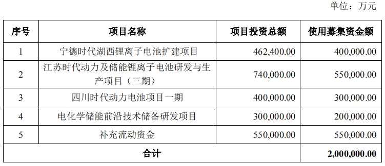 另外,寧德時(shí)代還發(fā)布了一項(xiàng)非公開發(fā)行預(yù)案,擬募集不超過200億元,分別用于“寧德時(shí)代湖西鋰離子電池?cái)U(kuò)建項(xiàng)目”、“江蘇時(shí)代動力及儲能鋰離子電池研發(fā)與生產(chǎn)項(xiàng)目(三期)”、“四川時(shí)代動力電池項(xiàng)目一期”、“電化學(xué)儲能前沿技術(shù)儲備研發(fā)項(xiàng)目”以及補(bǔ)充流動資金五項(xiàng)目。