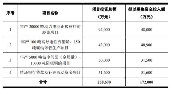 項目完成后,公司將新增年產(chǎn)5000噸金屬量鈷中間品、1萬噸陰極銅,新增合計年產(chǎn)3萬噸動力電池正極材料前驅(qū)體及新增年產(chǎn)100噸高導(dǎo)電性石墨烯、150噸碳納米管的產(chǎn)能。