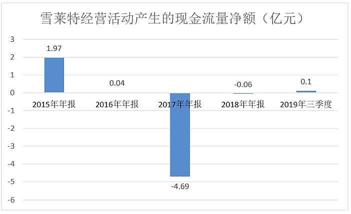 雪萊特自2015年至2018年年報及2019年三季度經(jīng)營活動產(chǎn)生的現(xiàn)金流量凈額情況。