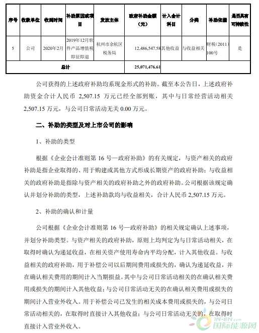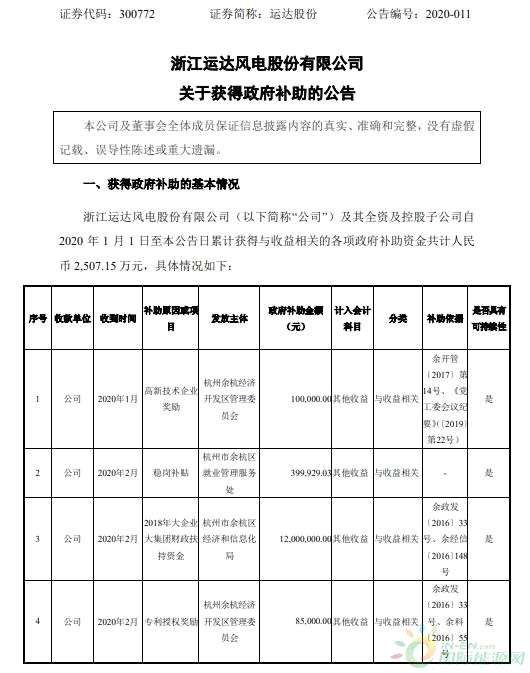 公告稱(chēng),浙江運(yùn)達(dá)風(fēng)電股份有限公司(以下簡(jiǎn)稱(chēng)“公司”)及其全資及控股子公司自2020 年1月1日至本公告日累計(jì)獲得與收益相關(guān)的各項(xiàng)政府補(bǔ)助資金共計(jì)人民幣 2,507.15 萬(wàn)元。